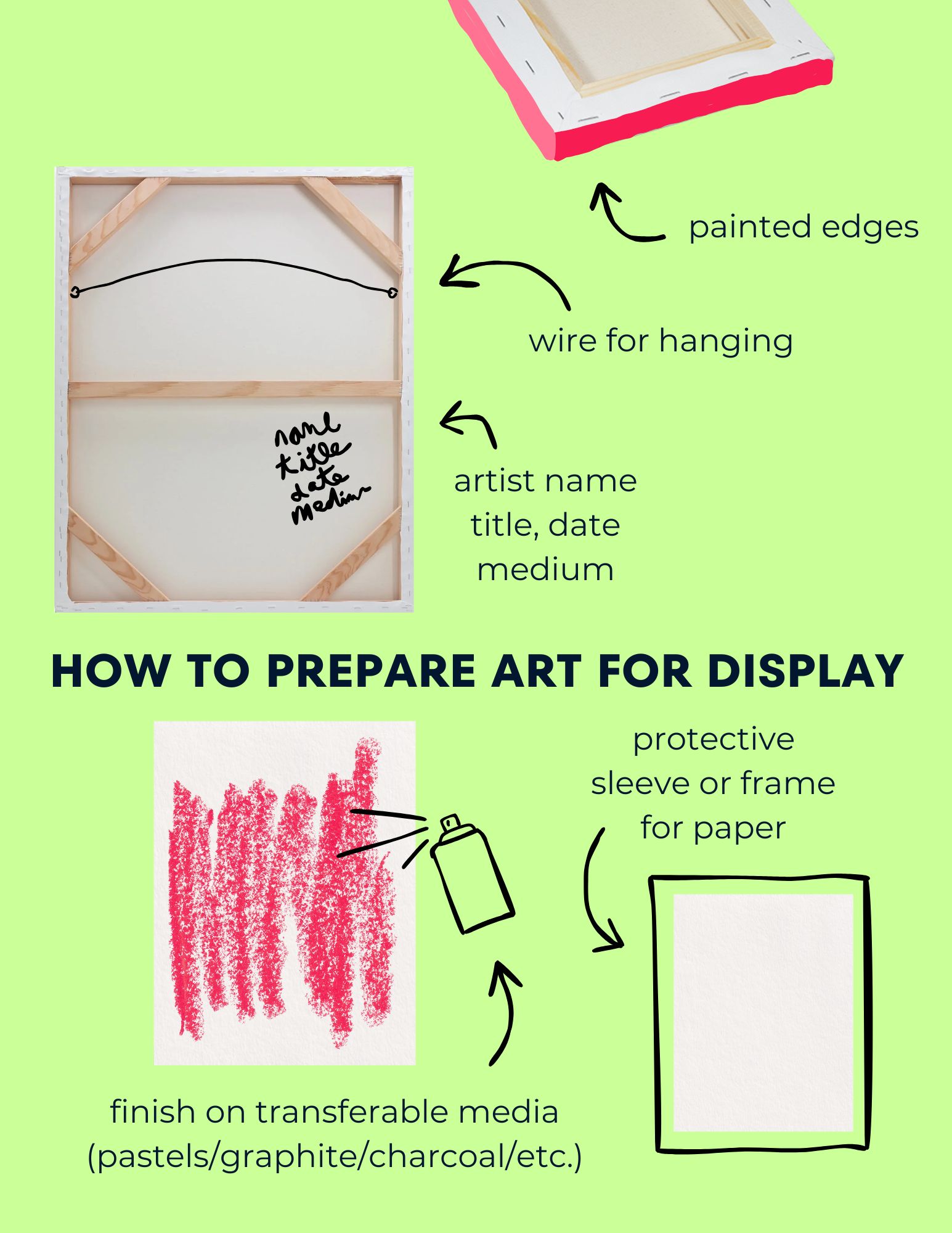*Canvases should have a wire on the back and sides painted. Transferable media should be set with a finishing spray. Paper should be protected by a sleeve or frame. Art may contain 3D elements, but must be prepared to hang.