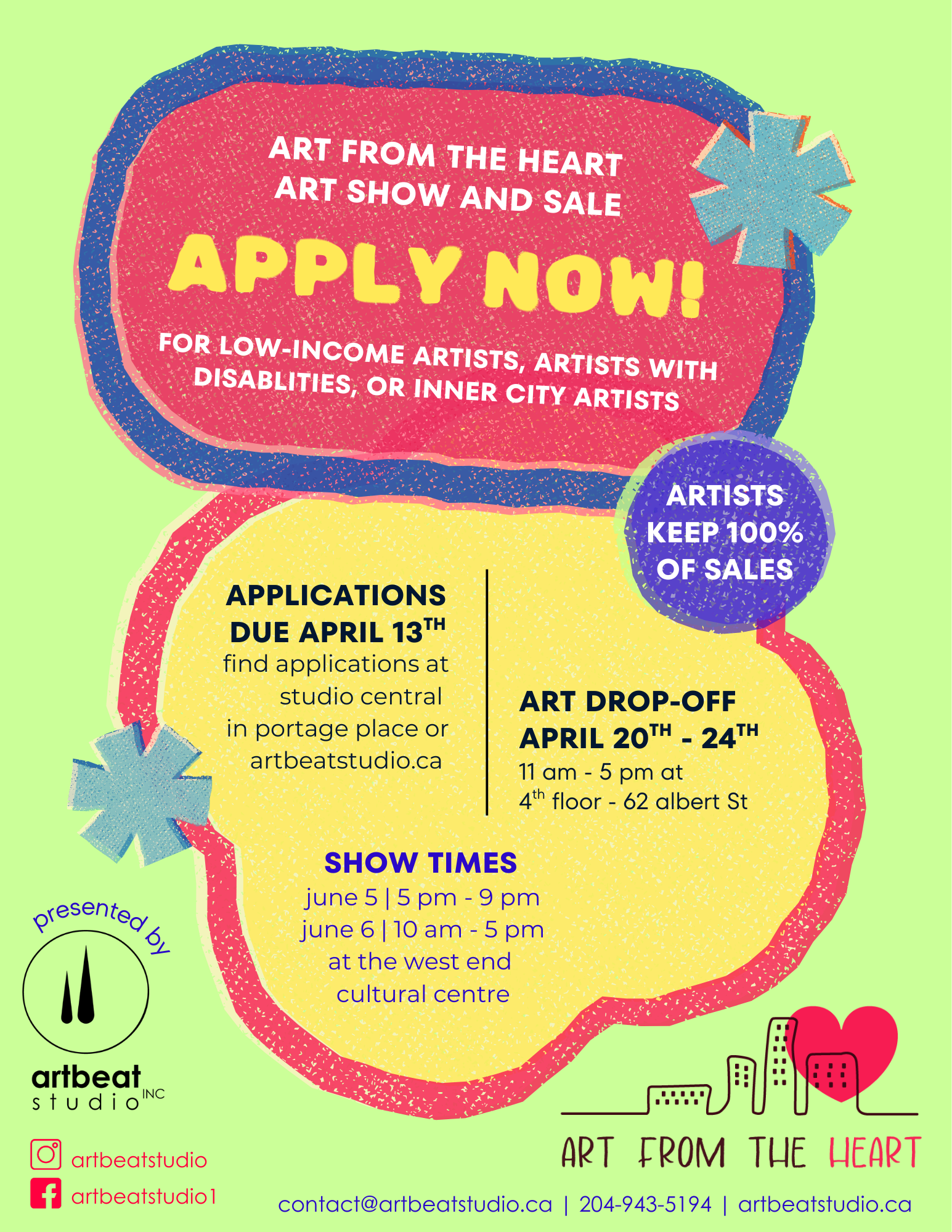 For any assistance in completing the application form and/or general information about this amazing event, please call us at (204) 943-5194 or write us at contact@artbeatstudio.ca.